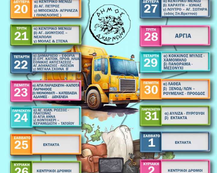 Η Διεύθυνση Καθαριότητας και Ανακύκλωσης του Δήμου Αχαρνών ανακοινώνει το πρόγραμμα αποκομιδής ογκωδών αντικειμένων από τις 20 Οκτωβρίου έως τις 2 Νοεμβρίου. Το πρόγραμμα δημοσιοποιείται με σκοπό τη διευκόλυνση του συντονισμού μεταξύ των δημοτών και της υπηρεσίας, ώστε να αποφεύγεται η παραμονή ογκωδών αντικειμένων στους δρόμους για μεγάλο χρονικό διάστημα. Τηλέφωνο Επικοινωνίας: 2132072471 Ώρες Λειτουργίας: Δευτέρα έως Παρασκευή, 09:00-13:00