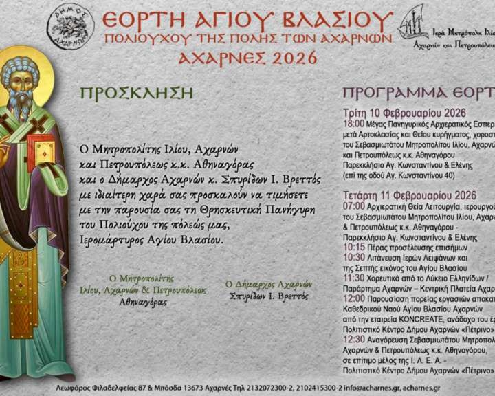 Ο Δήμαρχος Αχαρνών Σπύρος Βρεττός, η πρόεδρος του ΝΠΔΔ Όλγα Παυλίδου, οι ωφελούμενοι του ΚΔΑΠ ΑμεΑ "Αρωγή" & Βαμβακαρείου ΣΥΔ και το προσωπικό σας προσκαλούν στην ετήσια κοπή της Πρωτοχρονιάτικης Βασιλόπιτας. ΠΑΡΑΣΚΕΥΗ 6 ΦΕΒΡΟΥΑΡΙΟΥ 2026, ώρα 11:00 ΚΔΑΠ ΑμεΑ ΑΡΩΓΗ, Πλαταιών 23Α και Μπόσκιζας