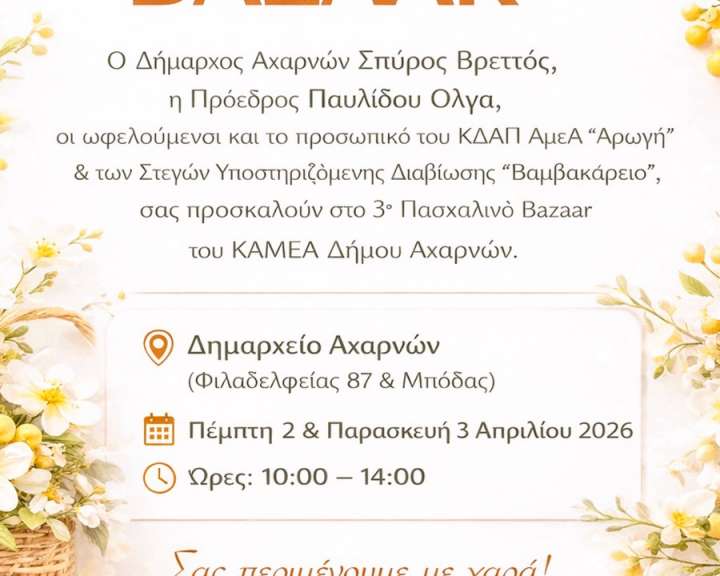 Ο Δήμαρχος Αχαρνών Σπύρος Βρεττός, η Πρόεδρος του ΝΠΔΔ Παυλίδου Όλγα, οι ωφελούμενοι και το προσωπικό του ΚΔΑΠ ΑμεΑ «Αρωγή» & των Στεγών Υποστηριζόμενης Διαβίωσης "Βαμβακάρειο" σας προσκαλούν στο 3ο Πασχαλινό Bazaar του ΚΑΜΕΑ Δήμου Αχαρνών. Πέμπτη 2 & Παρασκευή 3 Απριλίου 2026 10:00 έως 14:00 Δημαρχείο Αχαρνών (Φιλαδελφείας 87 & Αθ. Μπόσδα)