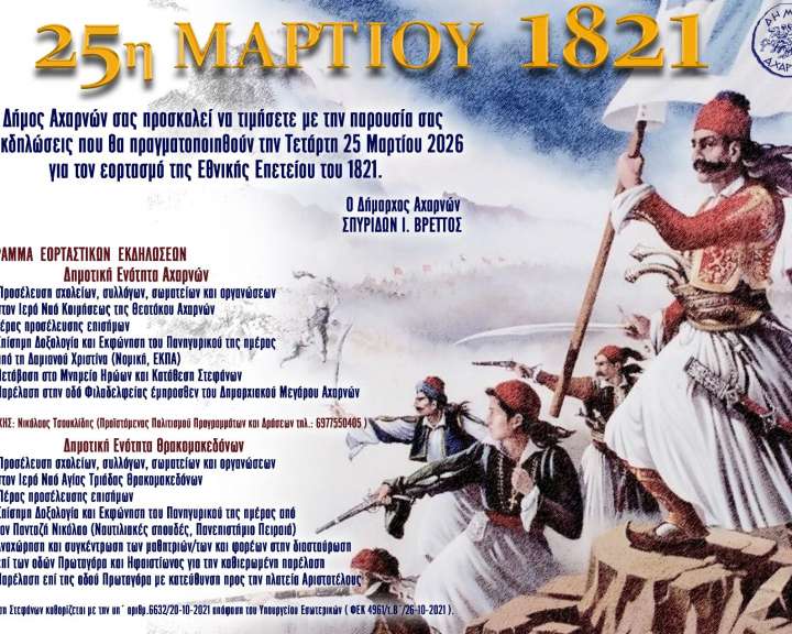 Ο Δήμος Αχαρνών σας προσκαλεί να τιμήσετε με την παρουσία σας τις εκδηλώσεις που θα πραγματοποιηθούν την Τετάρτη 25 Μαρτίου 2026 για τον εορτασμό της Εθνικής Επετείου του 1821. Ο Δήμαρχος Αχαρνών Σπυρίδων Ι. Βρεττός ΠΡΟΓΡΑΜΜΑ ΕΟΡΤΑΣΤΙΚΩΝ ΕΚΔΗΛΩΣΕΩΝ Δημοτική Ενότητα Αχαρνών