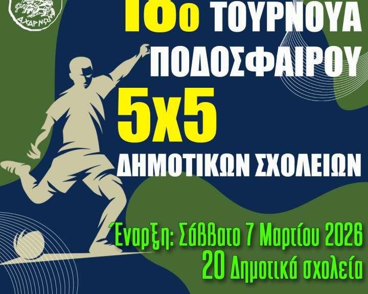 Ο Δήμος Αχαρνών και η Διεύθυνση Πολιτισμού & Αθλητισμού, όπως κάθε χρόνο έτσι και φέτος, διοργανώνει το 18ο Τουρνουά Ποδοσφαίρου 5x5 Δημοτικών Σχολείων, ενισχύοντας το αθλητικό πνεύμα και την ευγενή άμιλλα μεταξύ των μαθητών.