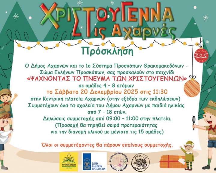 Ο Δήμος Αχαρνών και το 1ο Σύστημα Προσκόπων Θρακομακεδόνων - Σώμα Ελλήνων Προσκόπων, σας προσκαλούν στο παιχνίδι θησαυρού: «ΨΑΧΝΟΝΤΑΣ ΤΟ ΠΝΕΥΜΑ ΤΩΝ ΧΡΙΣΤΟΥΓΕΝΝΩΝ» σε ομάδες 4 – 8 ατόμων το Σάββατο 20 Δεκεμβρίου 2025 στις 11:30 στην Κεντρική πλατεία Αχαρνών (στην εξέδρα των εκδηλώσεων).