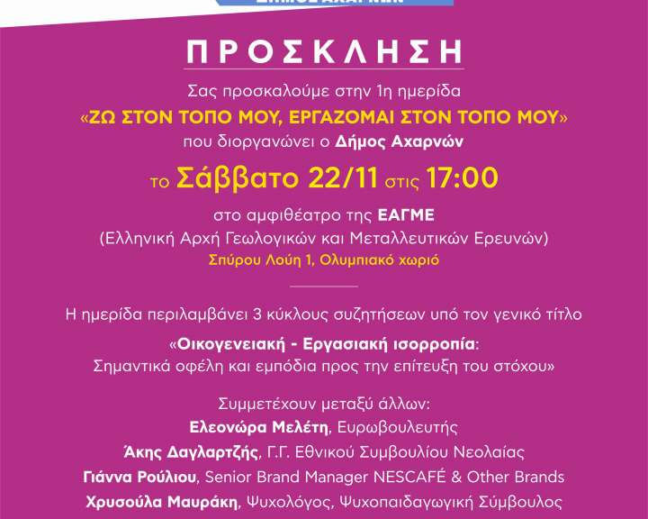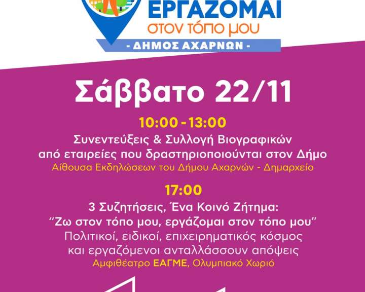 Στο πλαίσιο της ημερίδας «Ζω στον τόπο μου, εργάζομαι στον τόπο μου», η οποία θα πραγματοποιηθεί το Σάββατο 22/11, 10:00 – 13:00, στην Αίθουσα Εκδηλώσεων του Δήμου Αχαρνών, επιχειρήσεις από τις Αχαρνές θα βρίσκονται στον χώρο για να συνομιλήσουν με το κοινό, να παρουσιάσουν τις ευκαιρίες απασχόλησης που προσφέρουν και να παραλάβουν βιογραφικά σημειώματα από ενδιαφερόμενους.