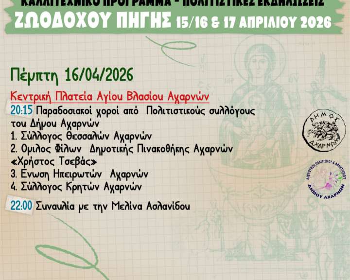 O Δήμος Αχαρνών και ο Δήμαρχος Σπύρος Βρεττός σας προσκαλούν στις εκδηλώσεις για τον εορτασμό της Ζωοδόχου Πηγής.