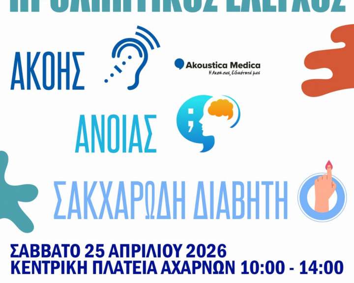 Η Αντιδήμαρχος Κοινωνικής Πολιτικής, Ισότητας, Δημόσιας Υγείας και Κοινοφελών Δομών με το Τμήμα Προστασίας και Προαγωγής της Δημόσιας Υγείας της Διεύθυνσης Κοινωνικής Πολιτικής σε συνεργασία με την εταιρεία Akoustica Medica προσκαλούν τους πολίτες να συμμετάσχουν σε μια σημαντική δράση πρόληψης και ενημέρωσης, που θα πραγματοποιηθεί το Σάββατο 25 Απριλίου, από τις 10:00 έως τις 14:00, στην Κεντρική Πλατεία Αγίου Βλασίου.