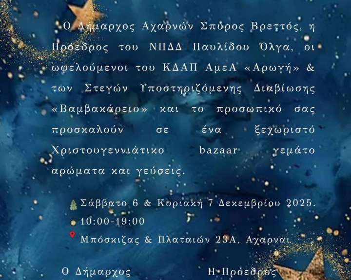 Το καθιερωμένο χριστουγεννιάτικο Bazaar του ΚΔΑΠ ΑμεΑ «Αρωγή» & των Στεγών Υποστηριζόμενης Διαβίωσης «Βαμβακάρειο» θα πραγματοποιηθεί στις 6 και 7 Δεκεμβρίου από τις 10:00 έως τις 19:00.