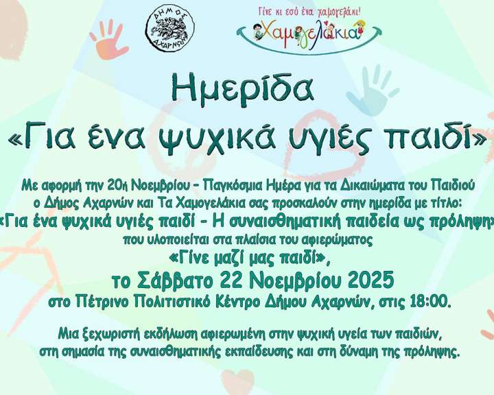 Με αφορμή την 20η Νοεμβρίου που έχει καθιερωθεί ως «Παγκόσμια Ημέρα για τα Δικαιώματα του Παιδιού» αλλά και τις 19 μέρες ακτιβισμού κατά της Παιδικής Κακοποίησης, ο Δήμος Αχαρνών και Τα Χαμογελάκια διοργανώνουν, στις 22 Νοεμβρίου, ημερίδα με θέμα «Για ένα ψυχικά υγιές παιδί.
