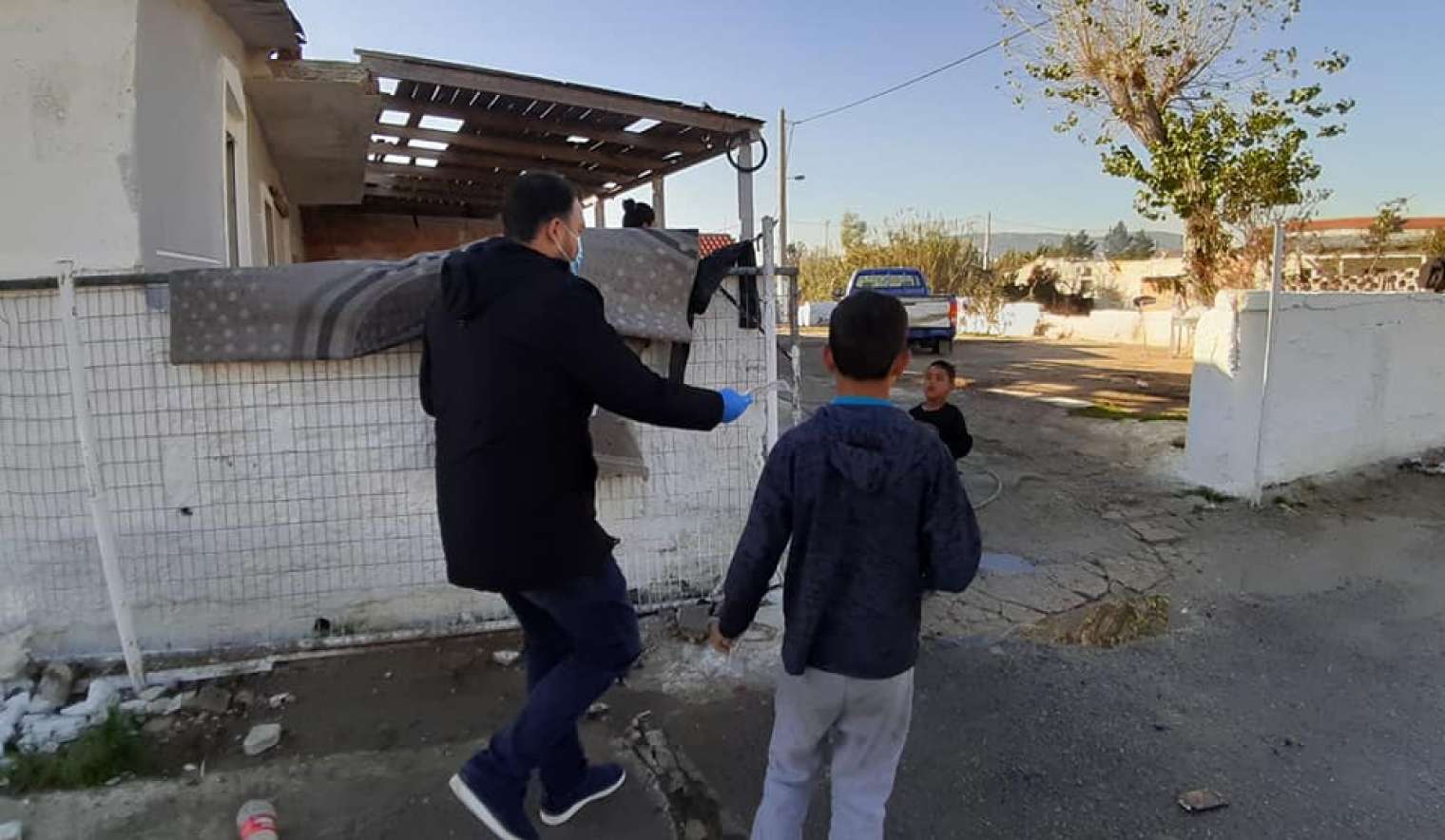 μοιράζοντας μάσκες και αντισηπτικό στους κατοίκους της περιοχής.
