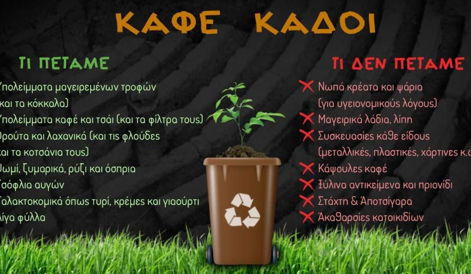 Πρόκειται για το πρώτο βήμα στην κατεύθυνση της χωριστής συλλογής βιοαποβλήτων. Αυτό όμως που έχει ιδιαίτερη σημασία για την επιτυχία της νέας αυτής προσπάθειας είναι όλοι να γνωρίζουμε πως στους καφέ κάδους ρίχνουμε μόνο οργανικά απορρίμματα.
