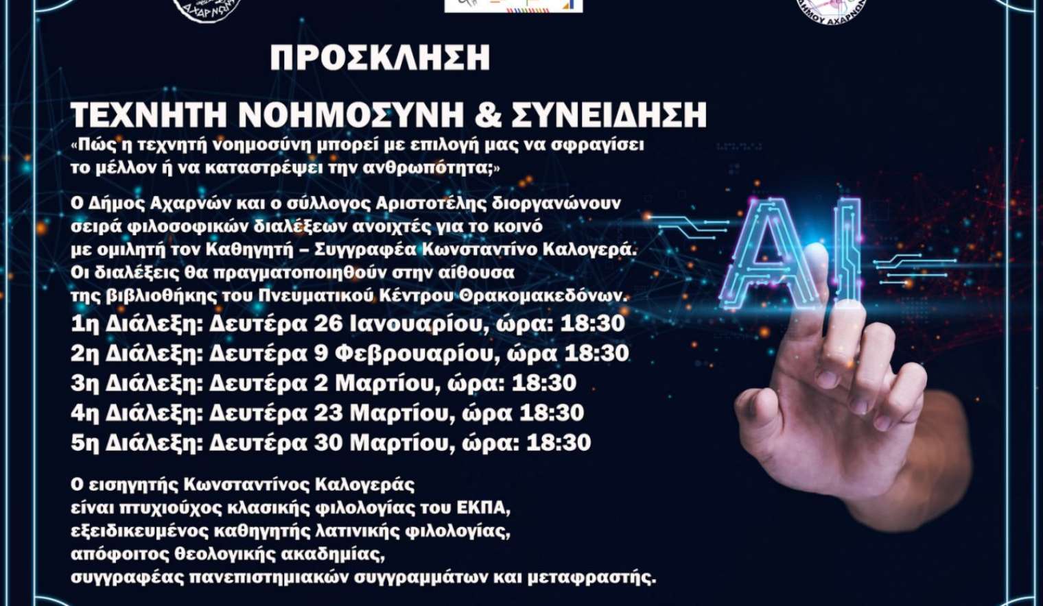 Ο Δήμος Αχαρνών και ο Σύλλογος Αριστοτέλης διοργανώνουν σειρά φιλοσοφικών διαλέξεων ανοιχτές για το κοινό με ομιλητή του καθηγητή – συγγραφέα Κωνσταντίνο Καλογερά.
