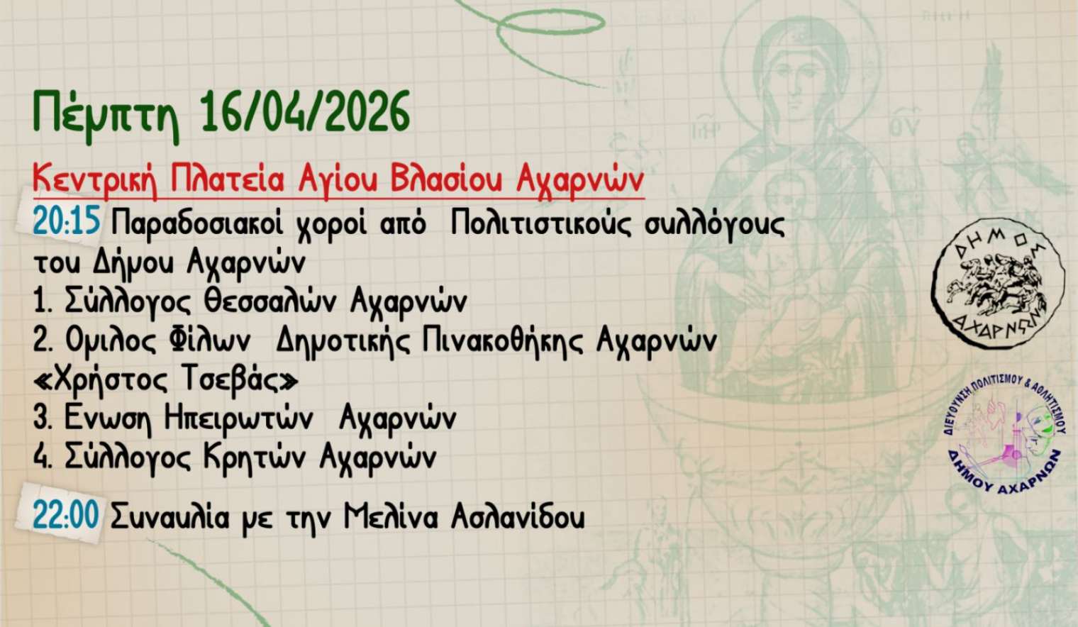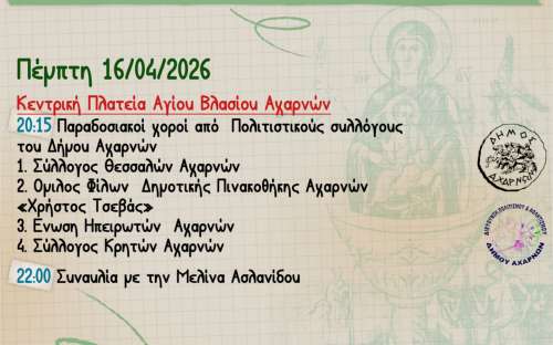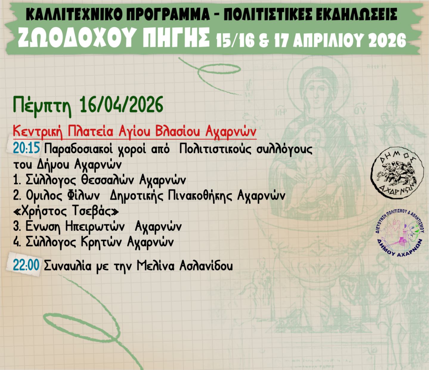 Δεύτερη μέρα σήμερα των πολιτιστικών εκδηλώσεων για τον εορτασμό της Ζωοδόχου Πηγής και η Κεντρική Πλατεία Αχαρνών θα γεμίσει χορό και μελωδίες.