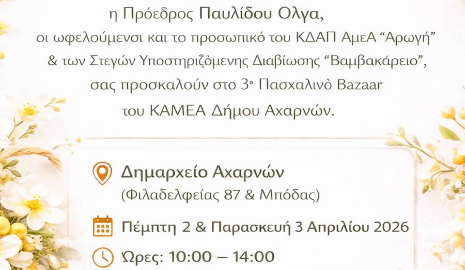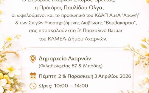 Ο Δήμαρχος Αχαρνών Σπύρος Βρεττός, η Πρόεδρος του ΝΠΔΔ Παυλίδου Όλγα, οι ωφελούμενοι και το προσωπικό του ΚΔΑΠ ΑμεΑ «Αρωγή» & των Στεγών Υποστηριζόμενης Διαβίωσης "Βαμβακάρειο" σας προσκαλούν στο 3ο Πασχαλινό Bazaar του ΚΑΜΕΑ Δήμου Αχαρνών.