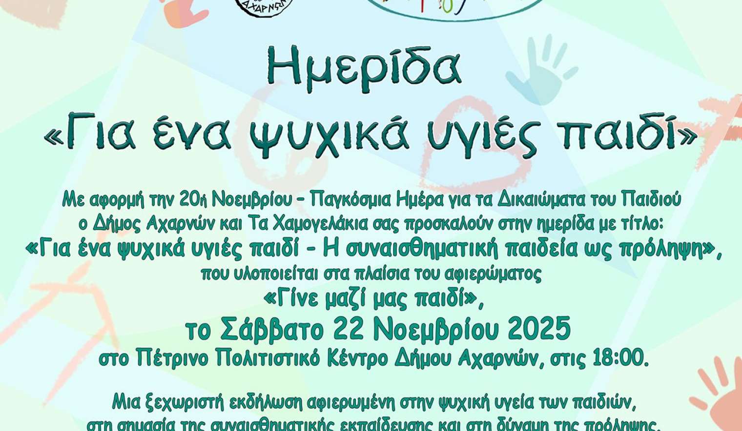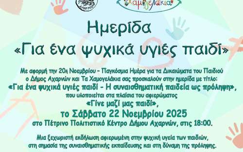 Με αφορμή την 20η Νοεμβρίου που έχει καθιερωθεί ως «Παγκόσμια Ημέρα για τα Δικαιώματα του Παιδιού» αλλά και τις 19 μέρες ακτιβισμού κατά της Παιδικής Κακοποίησης, ο Δήμος Αχαρνών και Τα Χαμογελάκια διοργανώνουν, στις 22 Νοεμβρίου, ημερίδα με θέμα «Για ένα ψυχικά υγιές παιδί. Η συναισθηματική παιδεία ως πρόληψη» στο Πέτρινο Πολιτιστικό Κέντρο του δήμου Αχαρνών στις 18:00 μ.μ.
