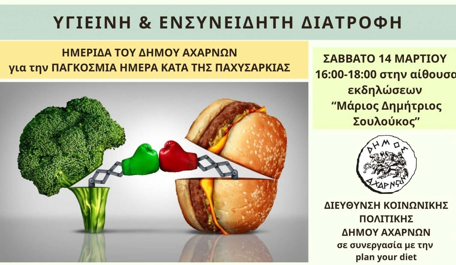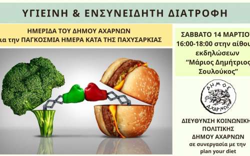Έχοντας υπόψη τα ανωτέρω και με στόχο την ευαισθητοποίηση των πολιτών μας για υγιεινές συνήθειες Διατροφής προσκαλούμε τους πολίτες να συμμετάσχουν σε μια σημαντική δράση πρόληψης και ενημέρωσης, που θα πραγματοποιηθεί το Σάββατο 14 Μαρτίου 2026, από τις 16:00 έως τις 18:00, στην αίθουσα εκδηλώσεων ‘’ΜΑΡΙΟΣ ΔΗΜΗΤΡΙΟΣ ΣΟΥΛΟΥΚΟΣ’’ του Δήμου Αχαρνών.