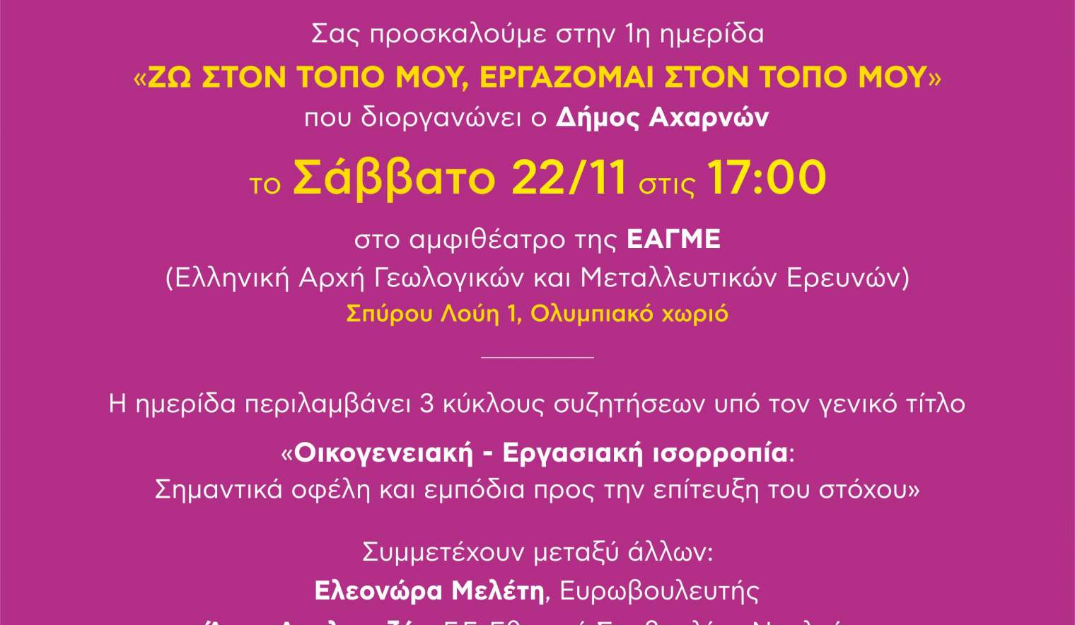 Το απόγευμα του Σαββάτου, 22 Νοεμβρίου, στο Αμφιθέατρο του ΕΑΓΜΕ, πολιτικοί, ειδικοί, στελέχη της αγοράς και εργαζόμενοι συναντώνται για να συζητήσουν ένα κοινό και κρίσιμο ζήτημα: «Ζω στον τόπο μου, εργάζομαι στον τόπο μου». Στο πλαίσιο της ημερίδας που διοργανώνει ο Δήμος Αχαρνών και φιλοδοξεί να αναδείξει προοπτικές, προκλήσεις και ιδέες που ενισχύουν τη δυνατότητα των πολιτών να ζουν και να εργάζονται στον τόπο τους, παρουσιάζονται οι ομιλητές που θα συμβάλουν με τις γνώσεις και την εμπειρία τους στον δημόσιο διάλογο.