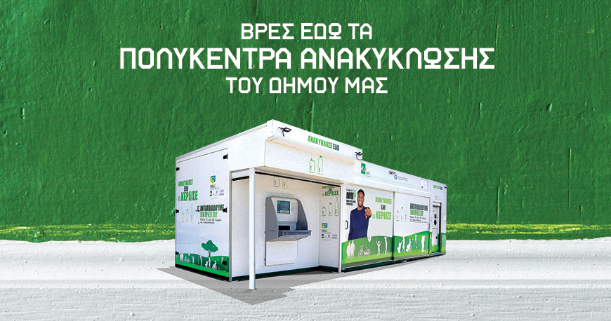 Σας προσκαλούμε να επισκεφθείτε και να ανακυκλώσετε γρήγορα, εύκολα και επικερδώς στα Υπερσύγχρονα Πολυκέντρα Ανακύκλωσης του Δήμου μας, τα οποία είναι τοποθετημένα στα εξής σημεία: