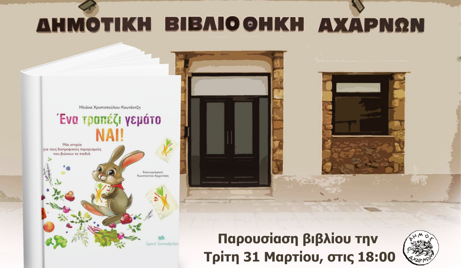 Με αφορμή την Παγκόσμια Ημέρα Παιδικού Βιβλίου (2 Απριλίου) η Δημοτική Βιβλιοθήκη Αχαρνών διοργανώνει βιβλιοπαρουσίαση με σκοπό να ευαισθητοποιήσει τα παιδιά στο θέμα των διατροφικών περιορισμών, αλλά και για να κατανοήσουν πως η σωστή ενημέρωση προσφέρει ασφάλεια και αποδοχή.