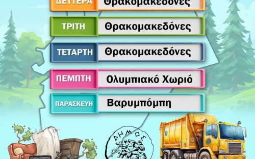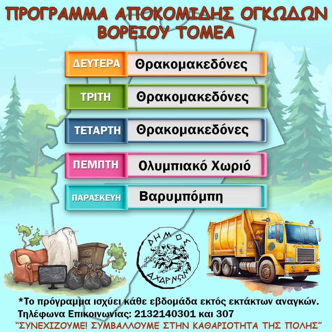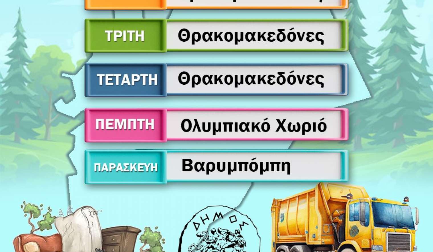 Η Διεύθυνση Καθαριότητας και Ανακύκλωσης με στόχο τη βελτίωση της καθημερινότητας και της εικόνας της πόλης ενημερώνει τους δημότες για το εβδομαδιαίο πρόγραμμα αποκομιδής ογκωδών αντικειμένων ΒΟΡΕΙΟΥ ΤΟΜΕΑ: Θρακομακεδόνες, Ολυμπιακό Χωριό, Βαρυμπόμπη.