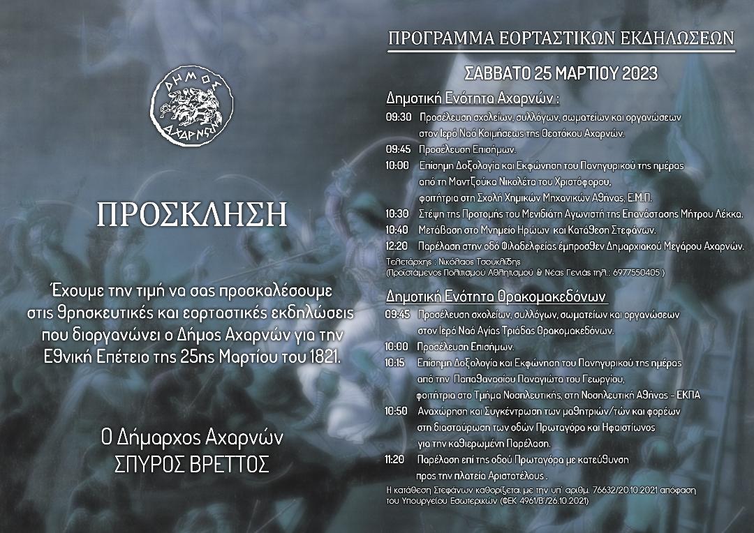 Ο Δήμος Αχαρνών σας προσκαλεί στις εορταστικές εκδηλώσεις που διοργανώνει για να τιμήσουμε την Εθνική Επέτειο του 1821. Ακολουθεί το πρόγραμμα εορτασμού και παρέλασης της 25ης Μαρτίου.