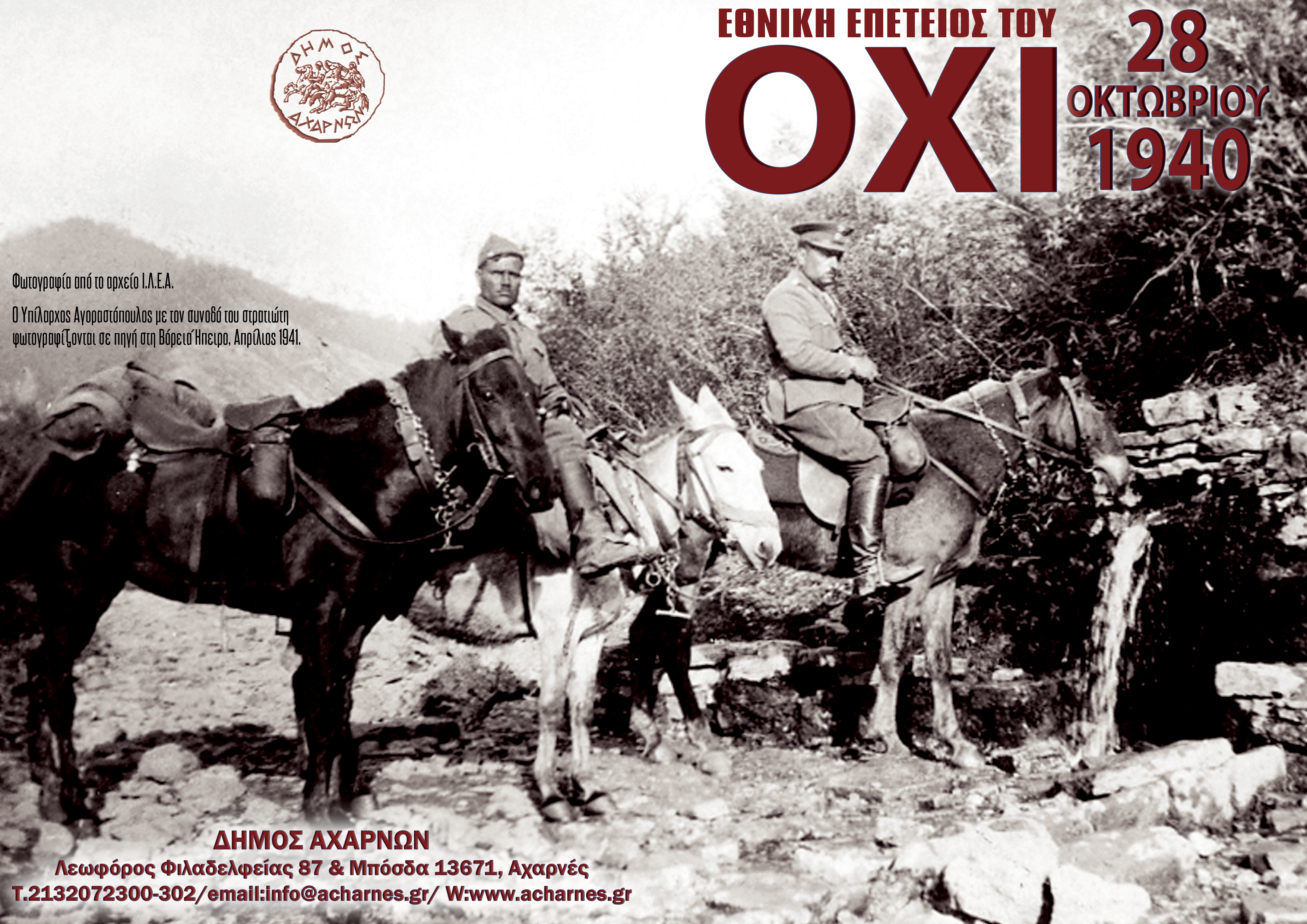 Ο Δήμος Αχαρνών σας προσκαλεί να τιμήσετε με την παρουσία σας τις εκδηλώσεις που θα πραγματοποιηθούν και στις δύο δημοτικές του ενότητες (Αχαρνές, Θρακομακεδόνες) τη Δευτέρα 28 Οκτωβρίου για τον εορτασμό της Εθνικής Επετείου του 1940.