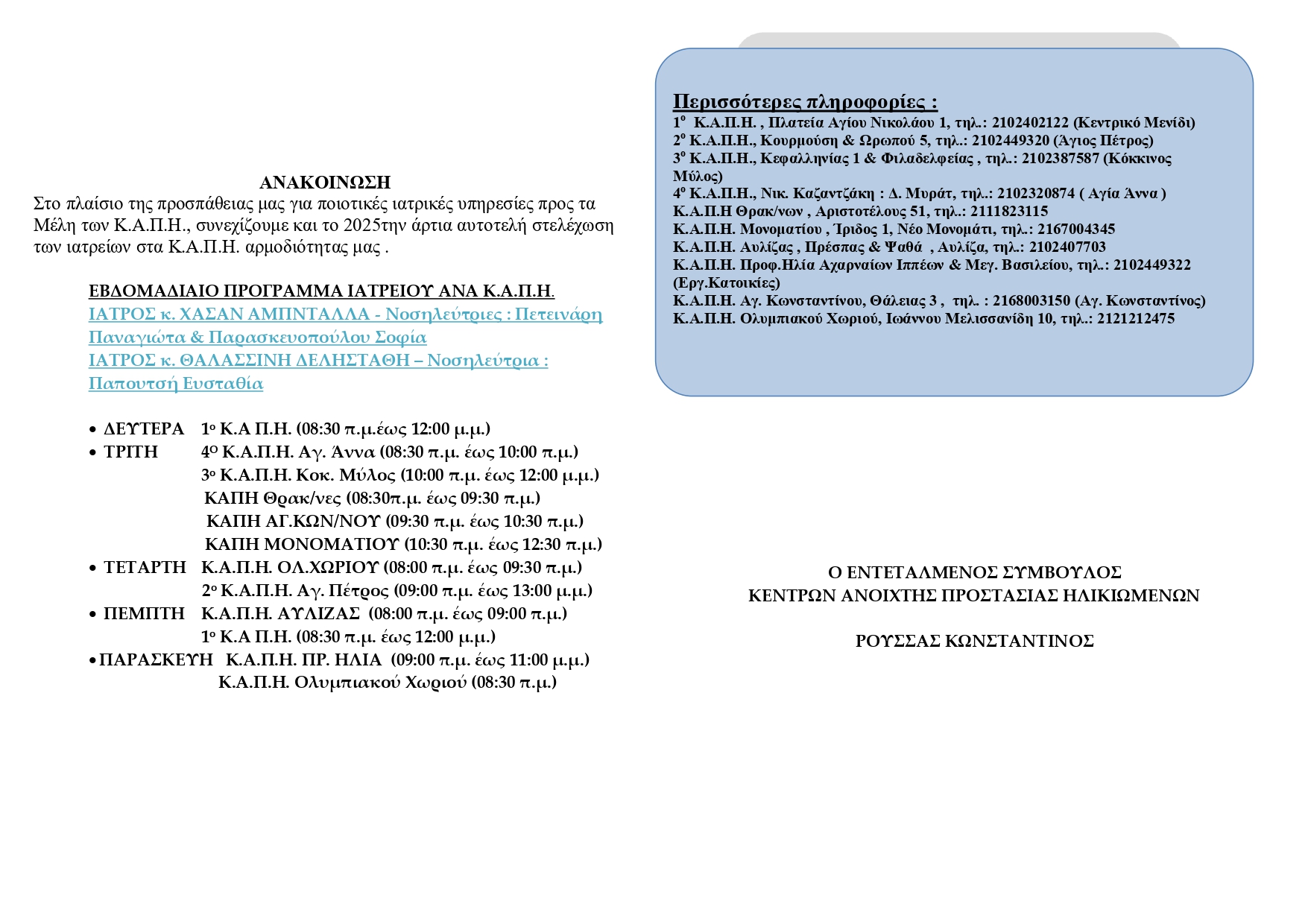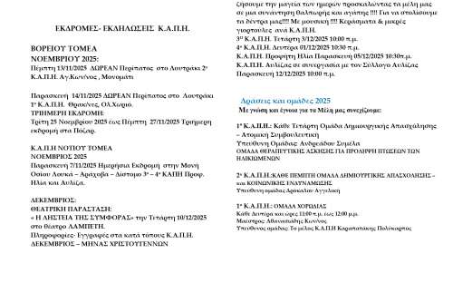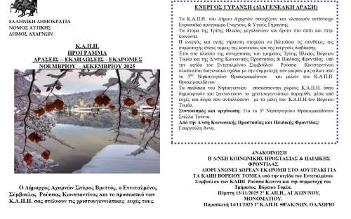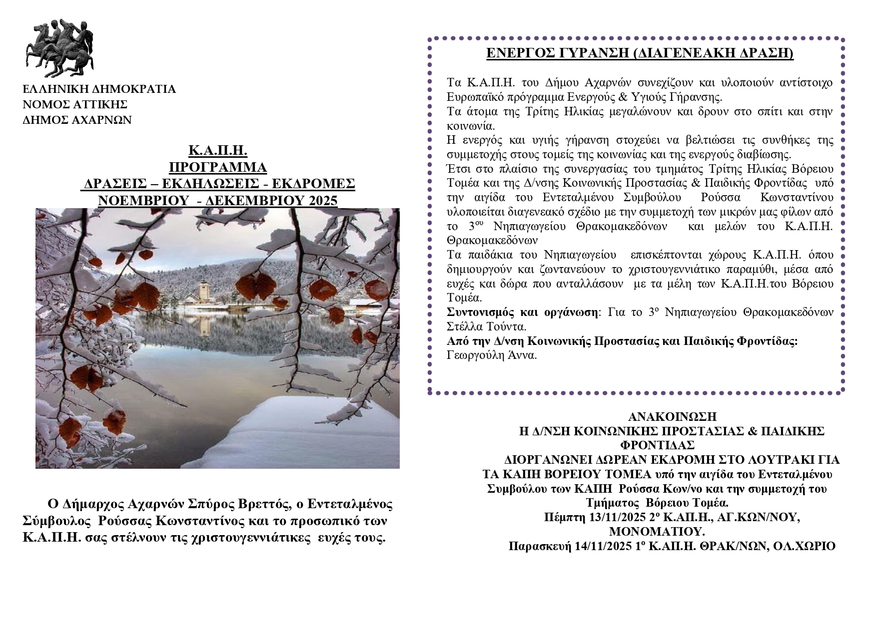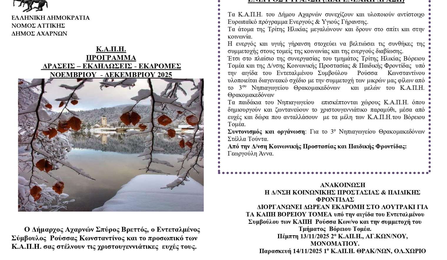 Ο Δήμος Αχαρνών, μέσω των Κέντρων Ανοιχτής Προστασίας Ηλικιωμένων (ΚΑΠΗ), ανακοινώνει ένα πλούσιο πρόγραμμα δραστηριοτήτων για τους μήνες Νοέμβριο και Δεκέμβριο 2025, με στόχο την ενίσχυση της κοινωνικότητας, της ψυχαγωγίας και της υγείας των μελών του.