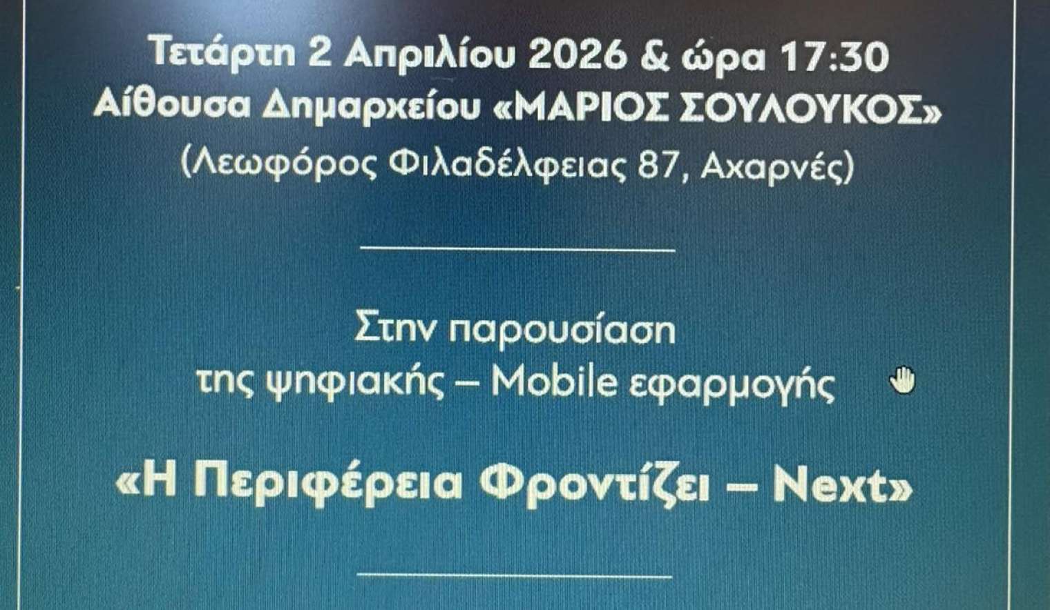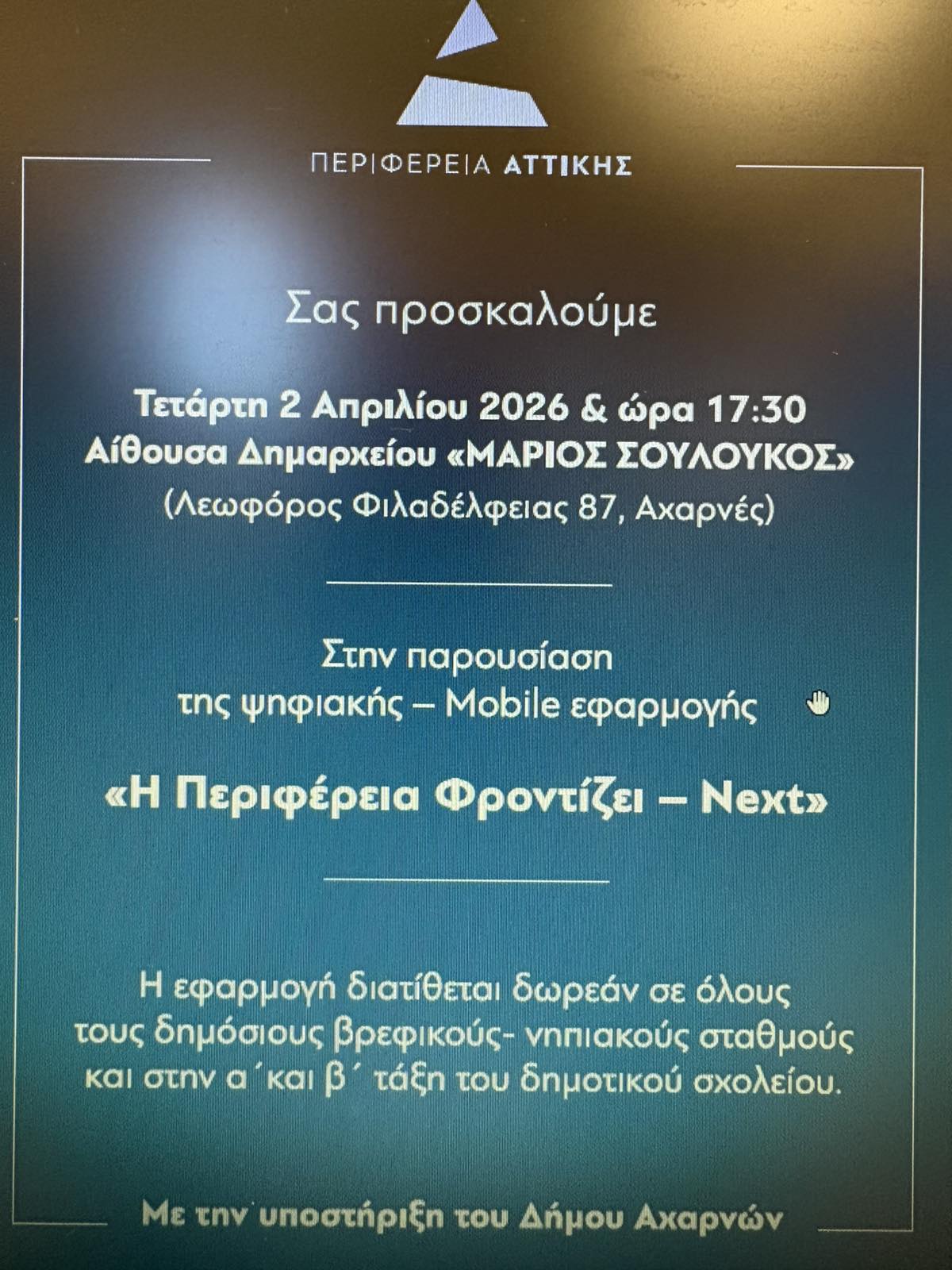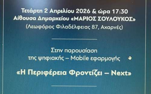 Ο Δήμος Αχαρνών και η Περιφέρεια Αττικής σας προσκαλεί στην παρουσίασης της ψηφιακής – mobile εφαρμογής ««Η Περιφέρεια Φροντίζει – Next» που θα πραγματοποιηθεί σε ειδική εκδήλωση την Πέμπτη 02/04/2026 και ώρα 17:30 στην αίθουσα εκδηλώσεων «Μάριος Σουλούκος».
