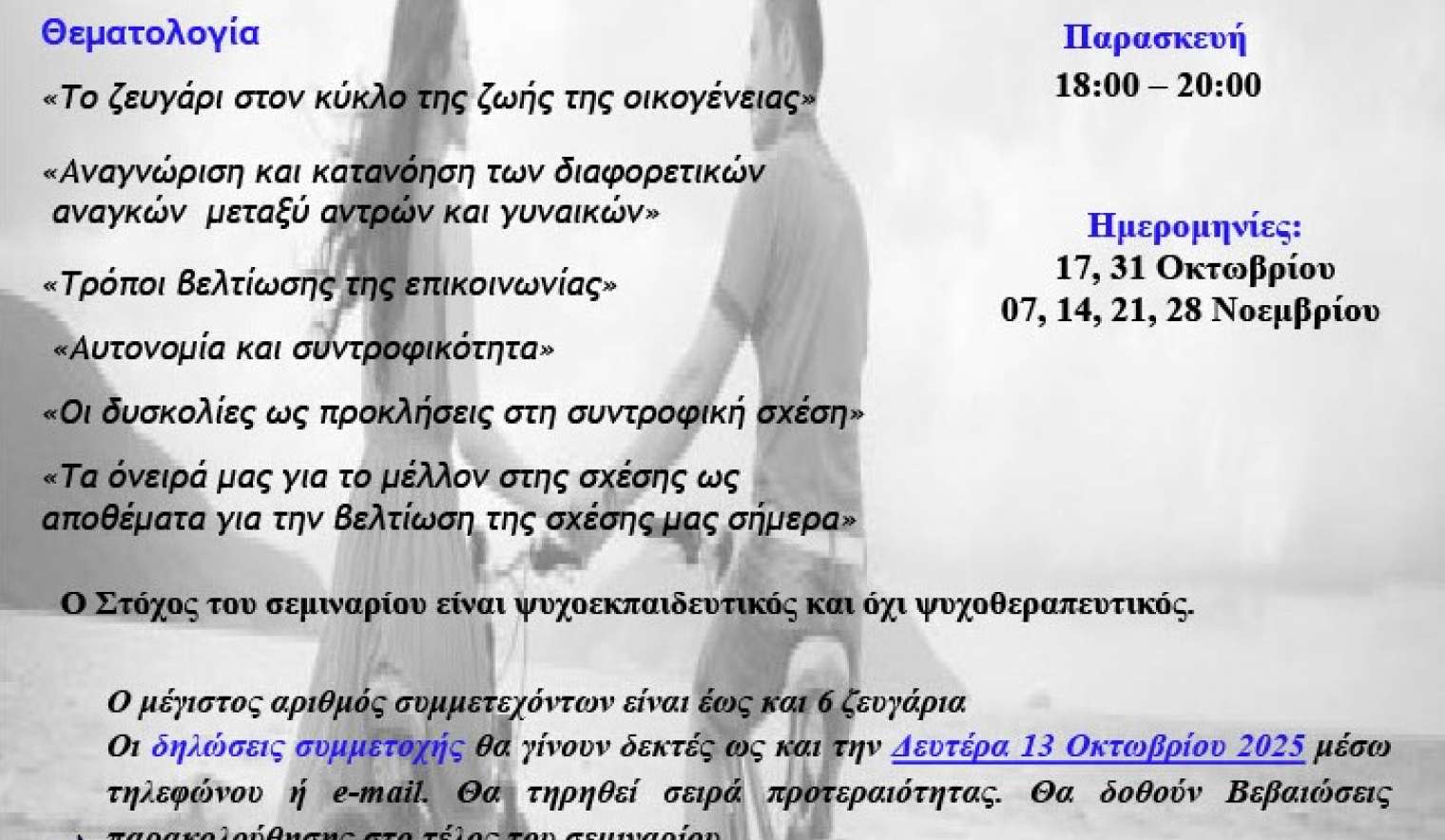 Με θεματολογία που αφορά κάθε σύγχρονο ζευγάρι το σεμινάριο έχει ψυχοεκπαιδευτικό στόχο. οι ενδιαφερόμενοι μπορούν να υποβάλλουν δήλωση συμμετοχής είτε ηλεκτρονικά είτε τηλεφωνικά επικοινωνώντας με τη Διέξοδο.