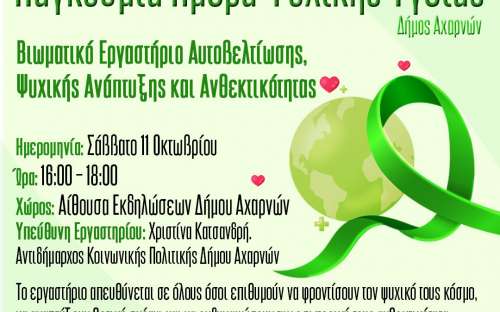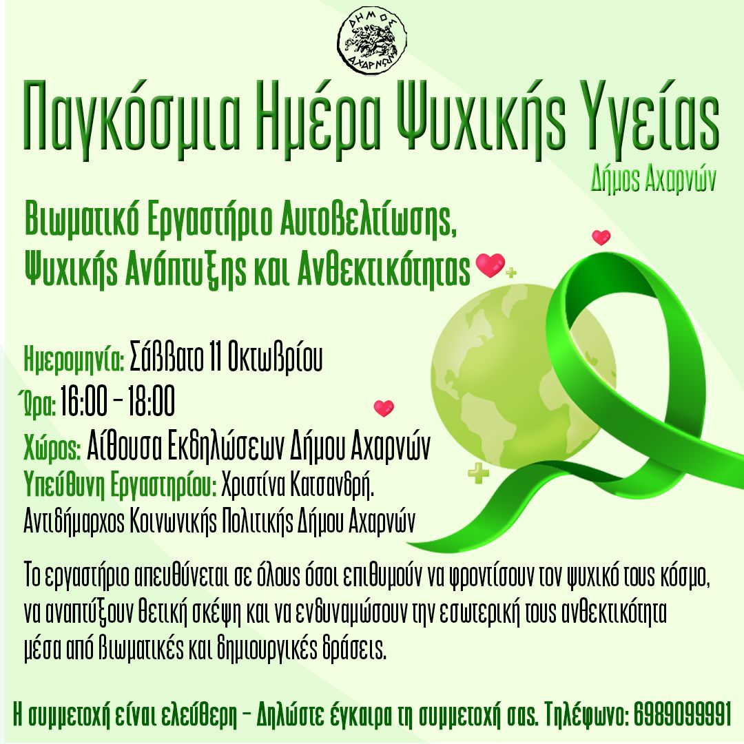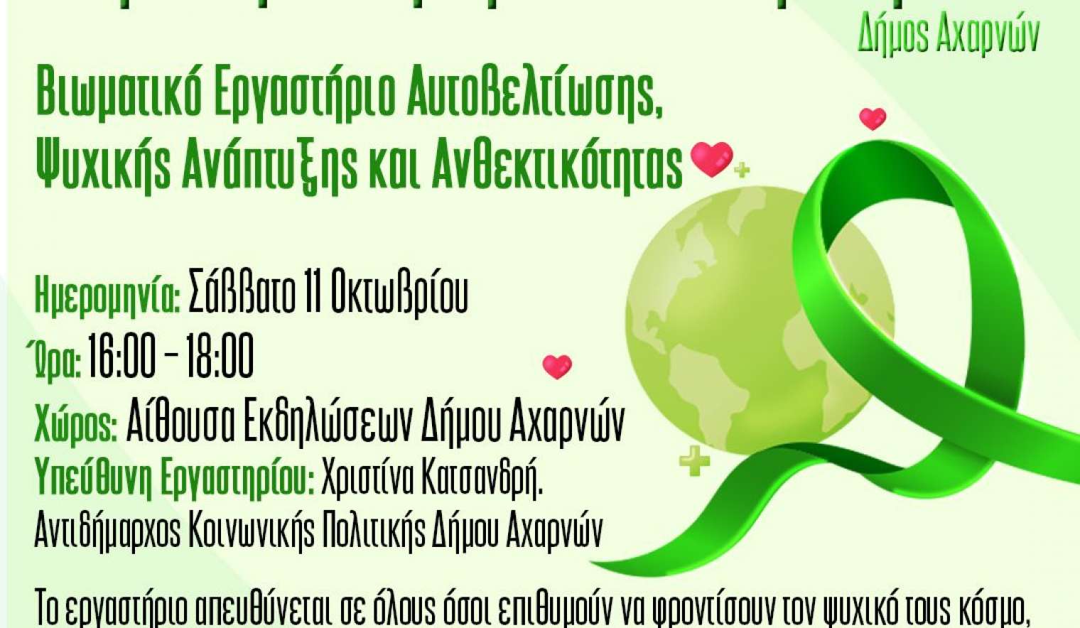 Με αφορμή την Παγκόσμια Ημέρα Ψυχικής Υγείας, ο Δήμος Αχαρνών διοργανώνει ένα βιωματικό εργαστήριο Αυτοβελτίωσης, Ψυχικής Ανάπτυξης και Ανθεκτικότητας, αφιερωμένο στην ενδυνάμωση, την εσωτερική ισορροπία και τη θετική στάση ζωής. Μέσα από δημιουργικές τεχνικές της θετικής ψυχολογίας, της χοροθεραπείας, της δραματοθεραπείας και της παιγνιοδράσης, οι συμμετέχοντες θα έχουν την ευκαιρία να:
