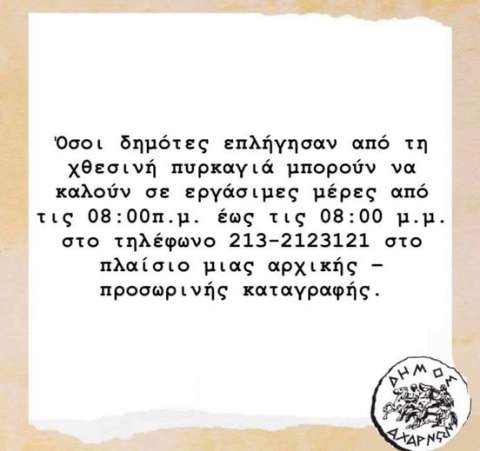 Ο Δήμος Αχαρνών ενημερώνει όλους τους δημότες που επλήγησαν από τη χθεσινή πυρκαγιά (σε κατοικίες, καταστήματα κτλ) πως μπορούν να καλούν σε εργάσιμες ημέρες από τις 08:00π.μ. έως τις 08:00 μ.μ. στο τηλέφωνο 213-2123121 στο πλαίσιο μιας αρχικής – προσωρινής καταγραφής.