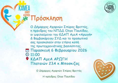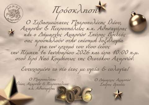 Ο Σεβασμιώτατος Μητροπολίτης Ιλίου, Αχαρνών & Πετρουπόλεως κ.κ. Αθηναγόρας και ο Δήμαρχος Αχαρνών Σπύρος Βρεττός σας προσκαλούν στην επίσημη δοξολογία για τον ερχομό του νέου έτους την Πέμπτη 1η Ιανουαρίου 2026 και ώρα 10:00 π.μ. στον Ιερό Ναό Κοιμήσεως της Θεοτόκου Αχαρνών.